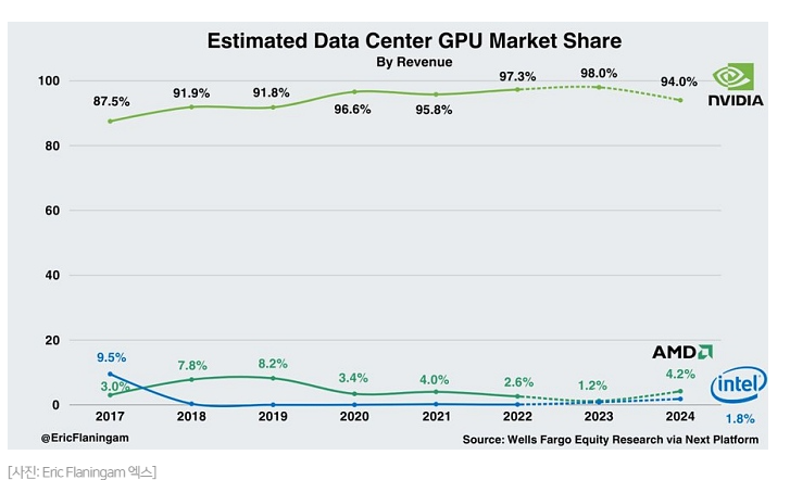 이렇게 될 수 있는 이유는 엔비디아가 시장 점유율을 90% 이상을 점유하고 있기 때문이다.