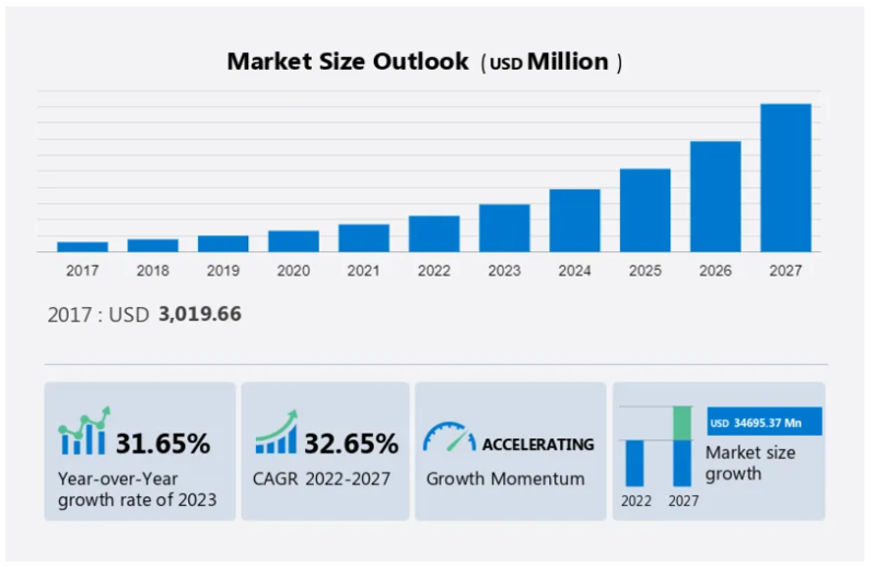 아래 그래프는 AI 시장의 성장 그래프이다. 2022년에서 2027년까지 연평균 32.65% 성장할 것으로 전망하고 있다.