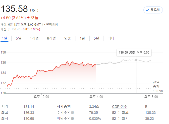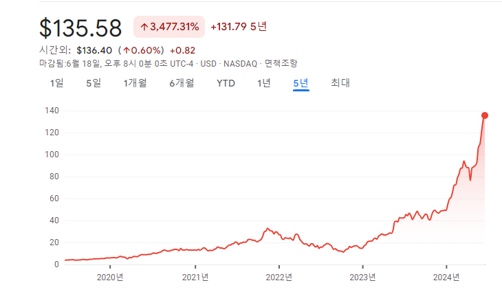 최근 엔비디아가 시총 3.34조(달러) 약 4609조 원으로으로 1위가 되었다. 올해들어서만 180%의 상승률을 보였고, 1999년에 나스닥 증권 거래소에 상장한 이후 현재까지 약 600000% 상승을 달성했다.