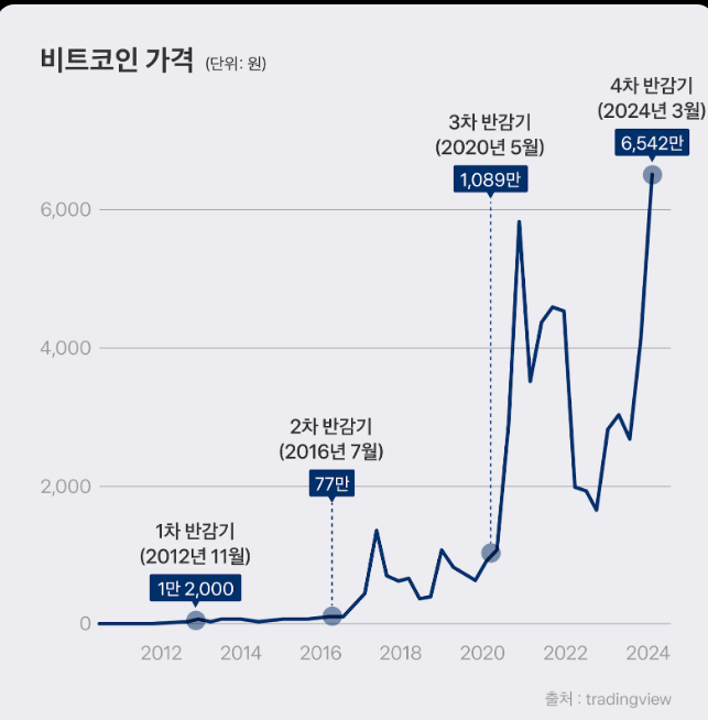 - 비트코인의 채굴 보상이 약 4년마다 절반으로 줄어드는 반감기 이벤트는 공급을 줄이고 희소성을 증가시켜 가격 상승 요인이 된다. 역사적으로 반감기 이후 비트코인 가격은 상승하는 경향이 있었다.