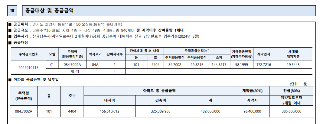 - 전용 84㎡: 4억 7200만 원 (미계약 물량은 4억 8200만 원)