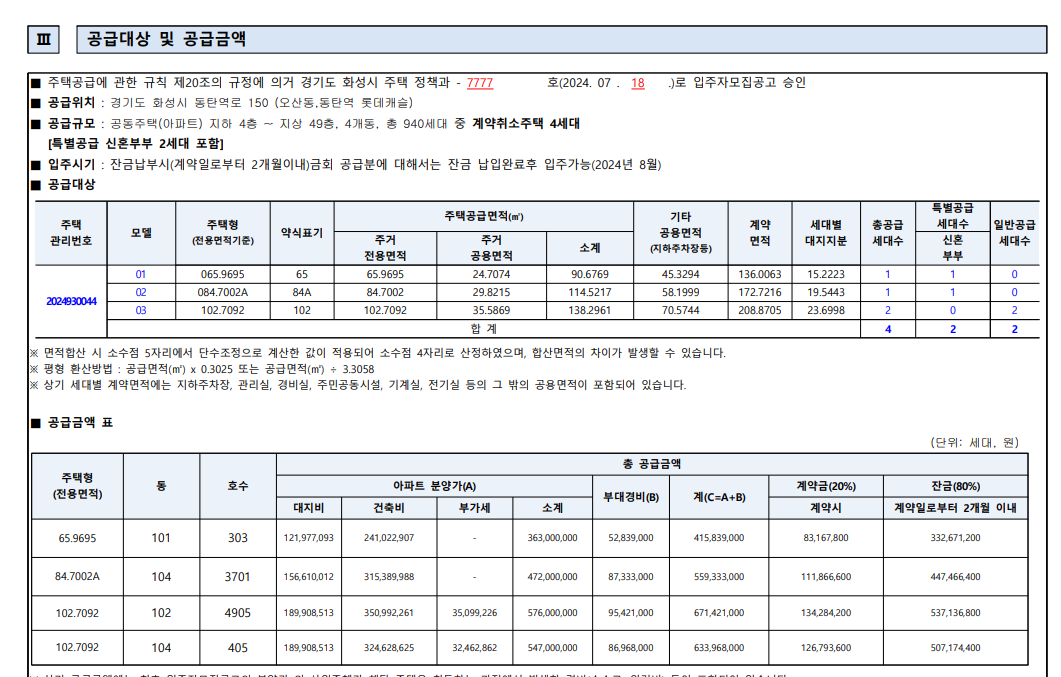 가장 중요한 청약 조건이다. 화성시 거주민 중 무주택 세대주라면 무조건 일반분양을 넣어야 할 것이다. 신혼 특공의 경우에는 혼인신고일부터 입주자모집공고일(24.07.22)까지 계속 무주택자이어야 하는 기준이 있기 때문에 잘 확인해야 할 것이다.