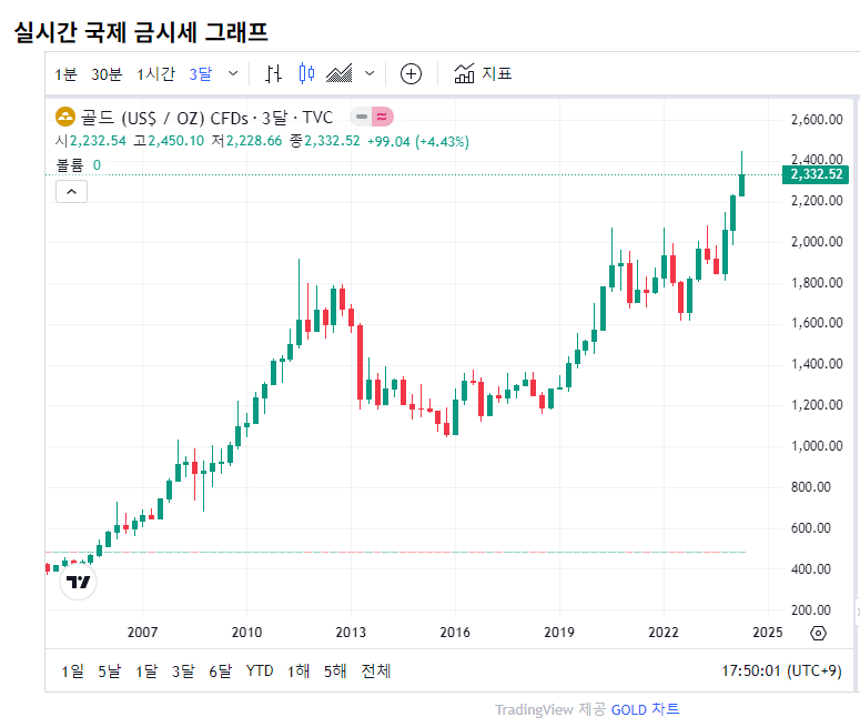 2024년 현재도 금 시세는 상승하는 경향을 보이는 이유는 경제적 불확실성과 함께 금의 안전 자산으로서의 매력 때문일 것이라 생각된다.