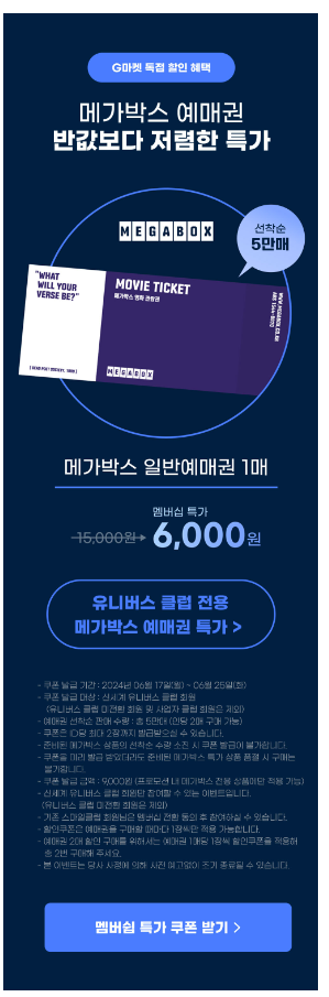 G마켓 유니버스 클럽에서는 메가박스 관람권을 할인받을 수 있는지 살펴보자. 먼저 유니버스 클럽에 가입하면 혜택이 주어지는데, 이때 메가박스 관람권을 할인받아 5000원에 구매할 수 있다 (단, 전 달 결제 금액 합산 10만원 이상)