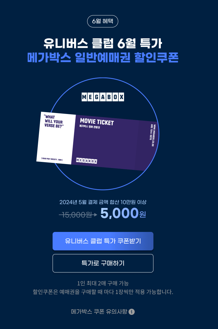 그러나 24년 6월에 한해서 신규 가입을 하게 되면 멤버쉽 4900원에 가입할 수 있다. 영화를 좋아하는 사람이라면, 4900원을 투자해 최소 1년 길게는 2년까지, 메가박스 관람권을 6000원에 구매할 수 있는 기회다. 유니버스 클럽에 가입하면 영화뿐만 아니라 다양한 혜택도 있으니 겸사겸사 이용하면 좋을 것 같다.